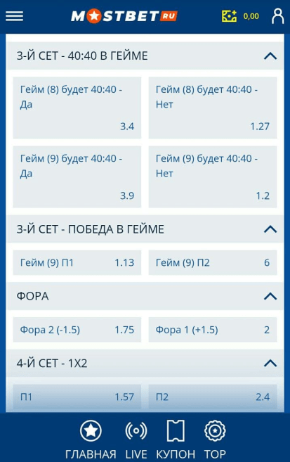Мостбет принимает пари примерно на 20 видов спорта и киберспорт. Количество матчей оставляет желать лучшего – представлены только основные и средние турниры.