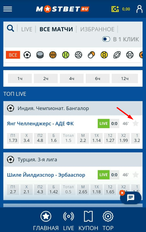Во вкладке «Избранное» находятся выбранные матчи (нужно нажать по звезде возле названия поединка).
