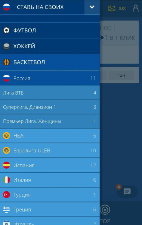 1. В левом верхнем углу нажмите по трем горизонтальным линиям. Кликните на подходящий вид спорта, а потом – на страну и чемпионат.