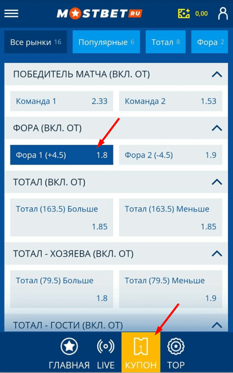Для более быстрого поиска варианта для пари, переключайтесь между вкладками: популярные, тотал, фора, 1-тайм, угловые и т.д.