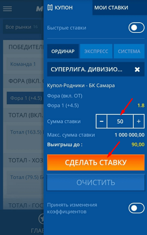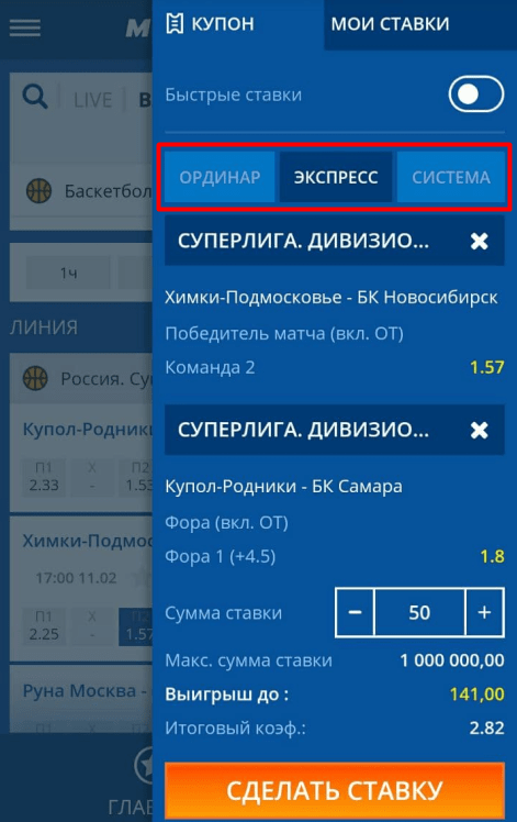 Если нужно сделать экспресс или систему, добавьте в купон больше исходов. Укажите сумму и тип пари (экспресс или размерность системы). Подтвердите ставку.